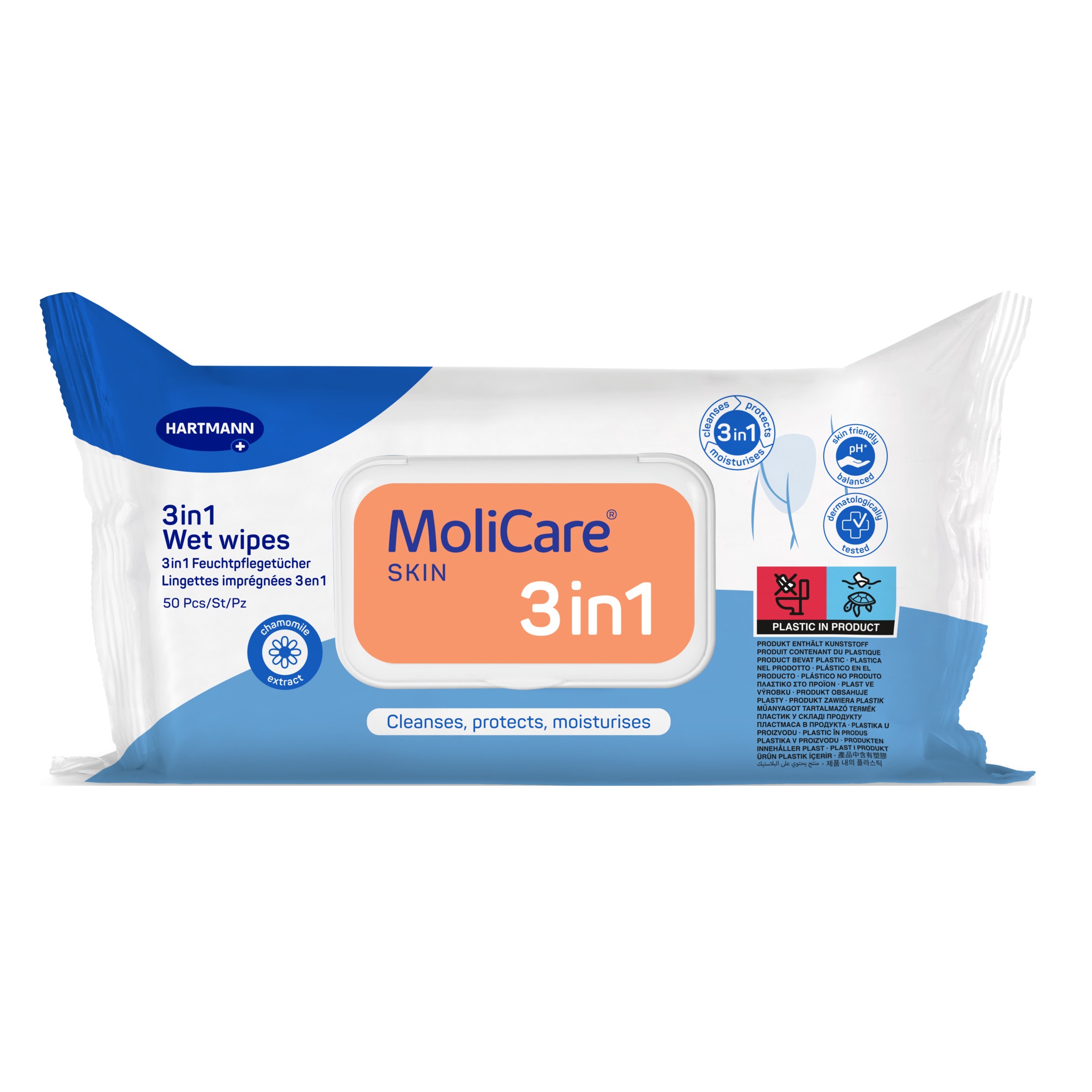 Molicare Skin toalhetes 3em1 50unidades são adequados para limpar, proteger e hidratar a pele, mesmo a pele sensível e irritada. São a solução prática e rápida para peles com risco de irritações.